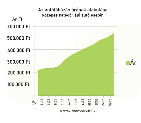 Autófóliázás nettó árának alakulása grafikonon 2012-2025 között